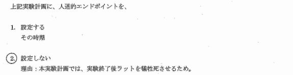 1−10 当初は「実験終了後ラットを犠牲死させるため」、人道的エンドポイントを「設定しない」と理由を書いておきながら、委員会からの「人道的エンドポイントを設定する必要があります。」との意見に対し、「エンドポイントの設定に関する書類が欠如しておりました」との説明はおかしいのではないでしょうか?申請者は人道的エンドポイントを理解していなかったのではないでしょうか?(実験終了後に動物を安楽死させることは人道的エンドポイントを設定しない理由にはなりませんので。)また、「ラットを犠牲死」はマウスの間違いではないでしょうか?