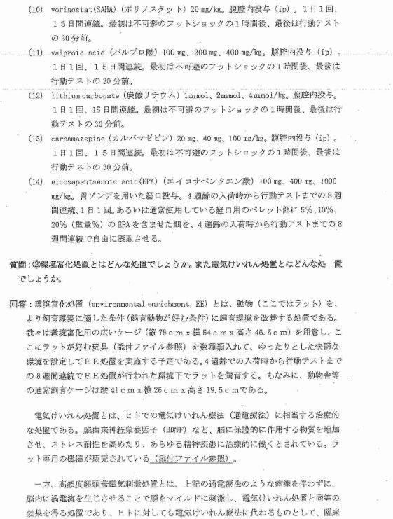 4−1 実験方法があまりに簡単すぎて、動物への処置も時系列も最初の計画書ではほとんど不明です。後に「メールでの質問と回答」で一部答えていますが、最初から詳細を書かせるべきではないでしょうか?