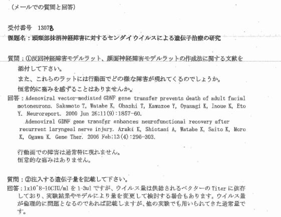 平成25年度 承認番号13078 研究課題名 頭頸部末梢神経障害に対するセンダイウイルスによる遺伝子治療の研究